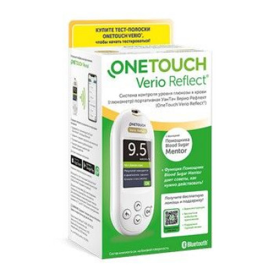 Система контроля уровня глюкозы в крови (глюкометр) портативная УанТач Верио Рефлект (OneTouch Verio Reflect®) предназначена для количественного измерения уровня глюкозы (сахара) в образцах свежей цельной капиллярной крови, взятой из кончика пальца. Система предназначена для использования вне тела человека (для диагностики in vitro) для помощи в управлении диабетом. Глюкометр OneTouch Verio Reflect® анализирует тренды, выявляет тенденции и дает советы (информационные, поведенческие и мотивирующие сообщения), которые помогают понимать и контролировать уровень глюкозы и распознавать отклонения в большую или меньшую сторону от желаемого диапазона значений. Глюкометр OneTouch Verio Reflect® может соединяться (синхронизироваться) с рядом совместимых беспроводных устройств с установленными на них программными приложениями. Подключив глюкометр к приложению OneTouch Reveal®, вы сможете просматривать результаты и строить графики, и выявлять тренды. Результаты измерения глюкометра и другие отслеживаемые данные передаются на совместимые устройства с помощью BLUETOOTH® (по беспроводной связи) или кабеля USB. Принцип измерения: Глюкоза, содержащаяся в образце крови, вступает в реакцию с ферментом FAD-GDH, содержащимся в тест-полоске, при этом возникает слабый электрический ток. Глюкометр измеряет силу тока и рассчитывает уровень глюкозы в крови. Результат анализа отображается на дисплее и сохраняется в памяти глюкометра. С глюкометром OneTouch Verio Reflect® следует использовать только контрольный раствор средней концентрации и тест-полоски OneTouch Verio®. Использование тест-полосок OneTouch Verio® с глюкометрами, для которых они не предназначены, может привести к получению неточных результатов.