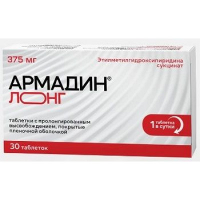 Армадин® лонг – пролонгированная лекарственная форма, обеспечивает равномерное суточное высвобождение действующего вещества в течение 20 ч и снижает вероятность возникновения побочных эффектов в результате резкого повышения его содержания в плазме крови. После приема натощак препарата Армадин® лонг – среднее значение tmax этилметилгидроксипиридина сукцината составляет 1,56 ч, прием пищи несколько замедляет абсорбцию этилметилгидроксипиридина сукцината – среднее значение tmax составляет 3,08 ч. Всасывание препарата начинается в желудке и происходит в тонком и толстом кишечнике. Скорость высвобождения и абсорбции этилметилгидроксипиридина сукцината из таблеток Армадин® лонг практически не зависит от отдела желудочно-кишечного тракта, рН и состава химуса. Этилметилгидроксипиридина сукцинат в организме человека метаболизируется, главным образом, в печени путем интенсивной конъюгации с глюкуроновой кислотой и выводится с мочой как в неизмененном виде, так и в виде глюкуронконъюгатов. Идентифицировано 5 метаболитов: 3-оксипиридина фосфат – образуется в печени, при участии щелочной фосфатазы распадается на фосфорную кислоту и 3-оксипиридин; 2-й метаболит – фармакологически активный, образуется в больших количествах и обнаруживается в моче на 1-2 сутки после введения; 3-й – выводится в больших количествах с мочой; 4-й и 5-й – глюкуронконъюгаты. Средний период полувыведения (T1/2) этилметилгидроксипиридина сукцината после приема натощак препарата Армадин® лонг – составляет 5,24 ч, в условиях после приема пищи – 3,86 ч. Быстро выводится с мочой в основном в виде метаболитов и в незначительном количестве – в неизменном виде. Показатели выведения с мочой неизмененного этилметилгидроксипиридина сукцината и метаболитов имеют индивидуальную вариабельность.