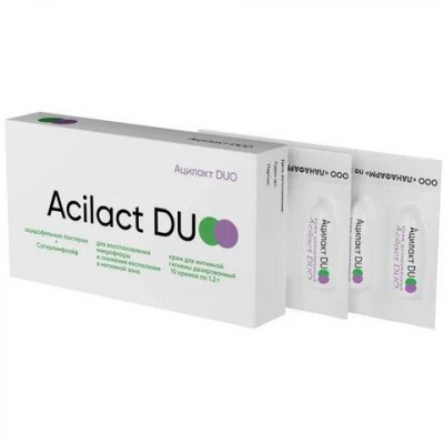 В качестве косметического средства для интимной гигиены. Крем Ацилакт Дуо применяют местно как при моно-, так и при комплексной помощи женщинам на фоне нарушения вагинальной микрофлоры, изменения физиологического уровня рН влагалища и угнетения факторов местного иммунитета, а так же при наличии жалоб на зуд, сухость, дискомфорт различного генеза в области наружных половых органов. Рекомендуется как самостоятельное средство во время и после приема антибиотиков, оральных контрацептивов, глюкокортикоидов, местном лечении вагинитов антисептиками, в послеродовый период.