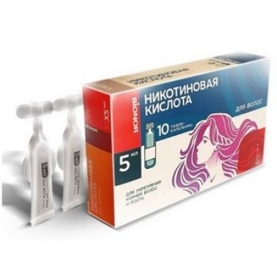 Никотиновая кислота для волос – косметическое средство для укрепления и стимуляции роста волос. Проникая в корни волос, никотиновая кислота расширяет сосуды, стимулирует циркуляцию крови и обмен веществ в волосяном мешочке, что способствует увеличению скорости роста волос. Никотиновая кислота при регулярном использовании: - пробуждает спящие волосяные луковицы и способствует росту волос, стимулируя микроциркуляцию; - восстанавливает и регенерирует поврежденные луковицы; - предотвращает выпадение волос, укрепляя корни и противодействуя уплотнению коллагена вокруг корня волоса; - способствует выработке меланина – пигмента, который делает локоны блестящими, сохраняет их натуральный цвет, предотвращает преждевременное появление седины; - нормализует функционирование сальных желез, избавляет волосы от регулярного появления жирной пленки; - сохраняет влагу в коже головы и волосах; - насыщает волосяные фолликулы кислородом, ускоряет обменные процессы. Не сушит кожу в случае многократного использования.